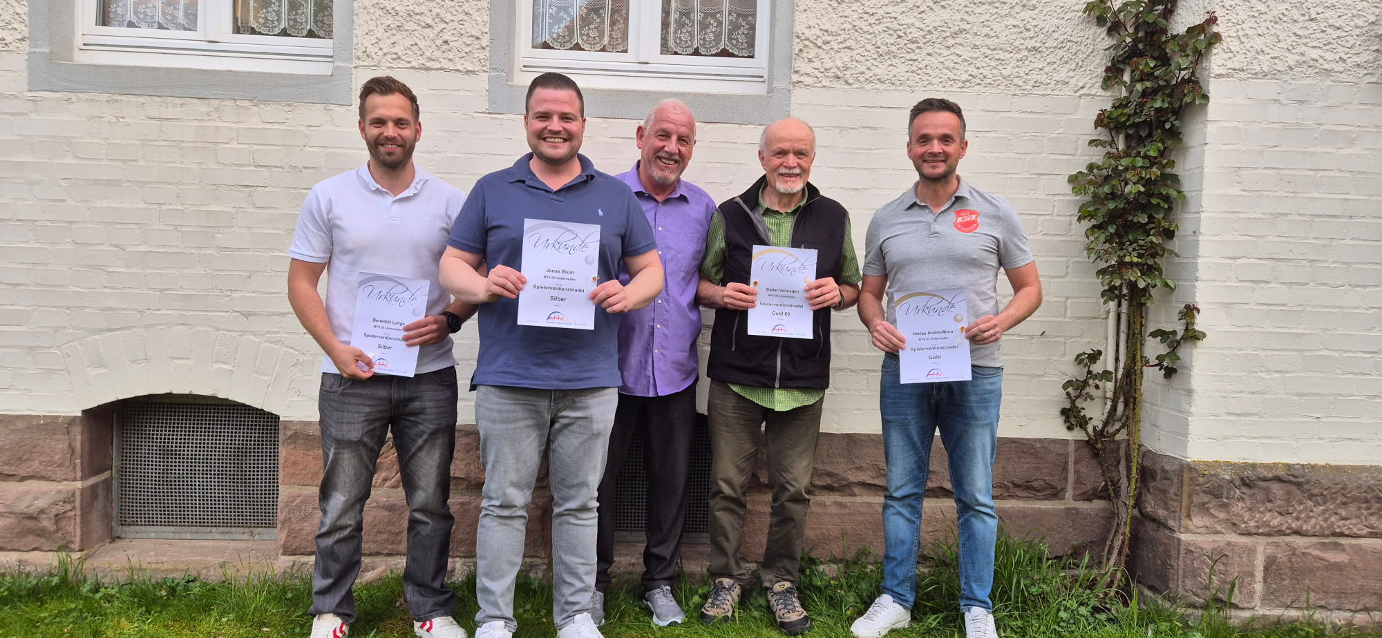 v.l. Benedikt Lange mit Silber, Jonas Blum mit Silber, Spartenleiter Stefan Blum, Dieter Velmeden mit Gold (60Jahre) sowie Niklas André-Mora mit Gold.