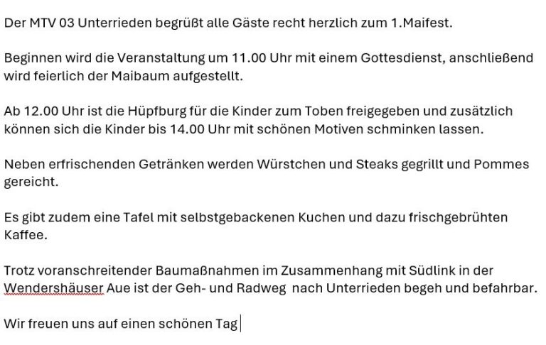 Der MTV möchte mit Dir ein Maifest mit Maibaum aufstellen feiern.